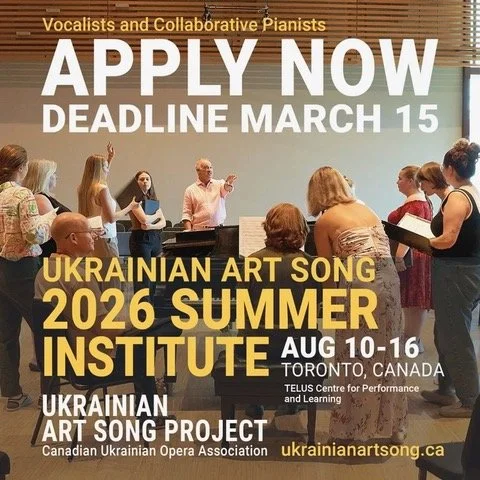 Vocal artists and collaborative pianists—professional, emerging, upper-undergraduate, and graduate—are invited to apply to the Ukrainian Art Song Summer Institute taking place in Toronto, Canada, from August 10 to 16, 2026.